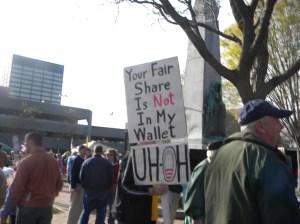 we are just minutes away from the start of the event and it is really beginning to fill up now. There are people of all ages here– young and old alike. There is a friendly, festive feeling in the air, hardly the angry mob that the media likes to portray us as. People are having fun and laughing and preparing for the speakers.